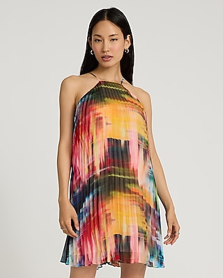 A breezy trapeze style mini dress complete with an abstract print, a pleated finish, and a halter neckline.