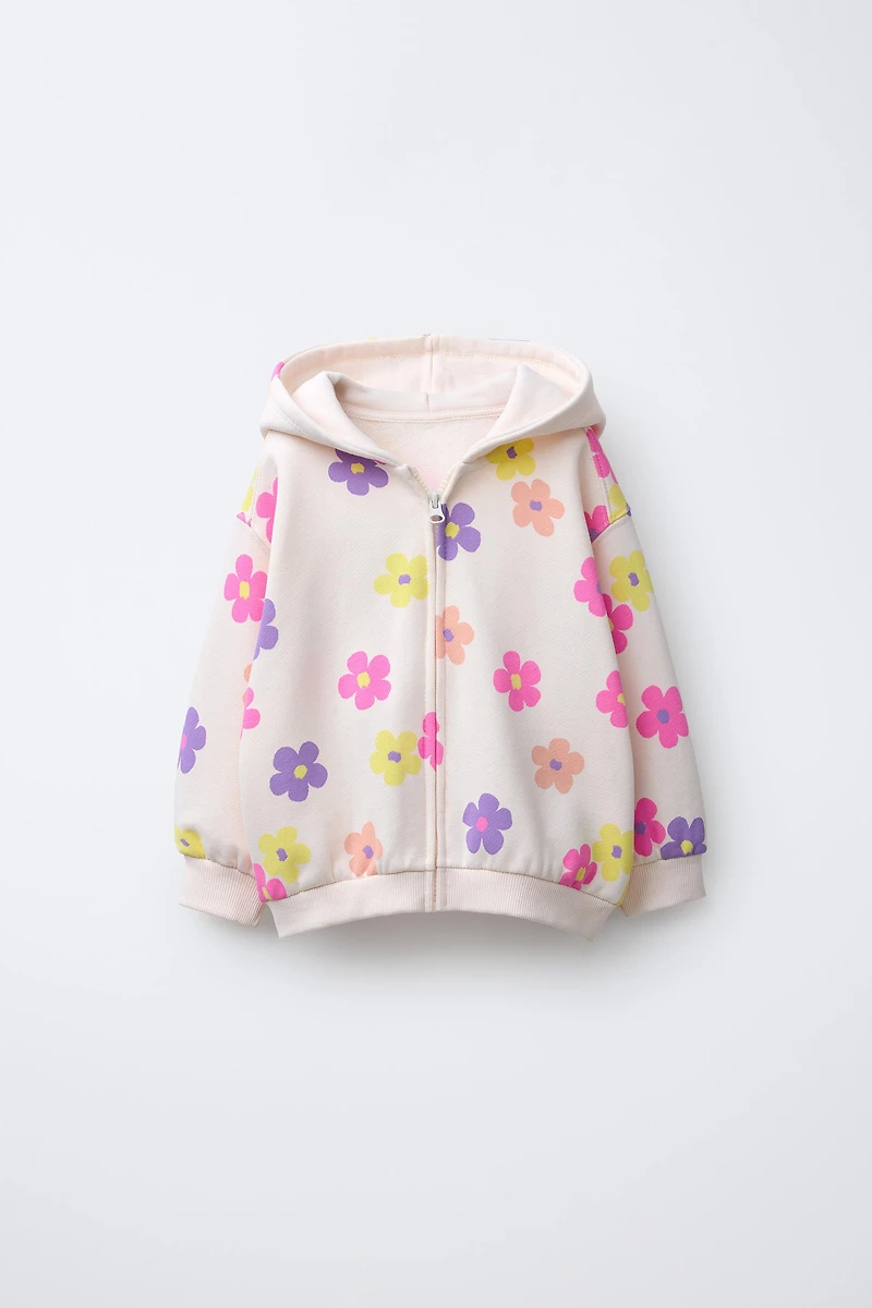 Long sleeve hoodie sweatshirt. Ribbed trim. Front zip closure. Front patch pockets. All-over print.