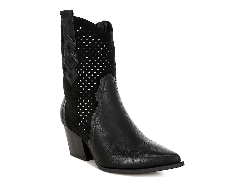 Add a bit of glam to a laidback style with the Prosia Western boots from London Rag. Crafted with a cowboy-inspired vamp, intricate stitching, and featuring detailed cutouts with a silver metallic hue underneath.