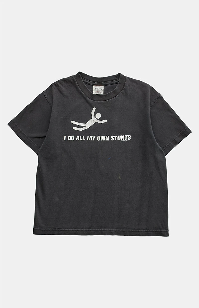 Relive the past in this 2000s I Do My Own Stunts Baby Graphic T-Shirt. This vintage graphic t-shirt features short sleeves and a front graphic.