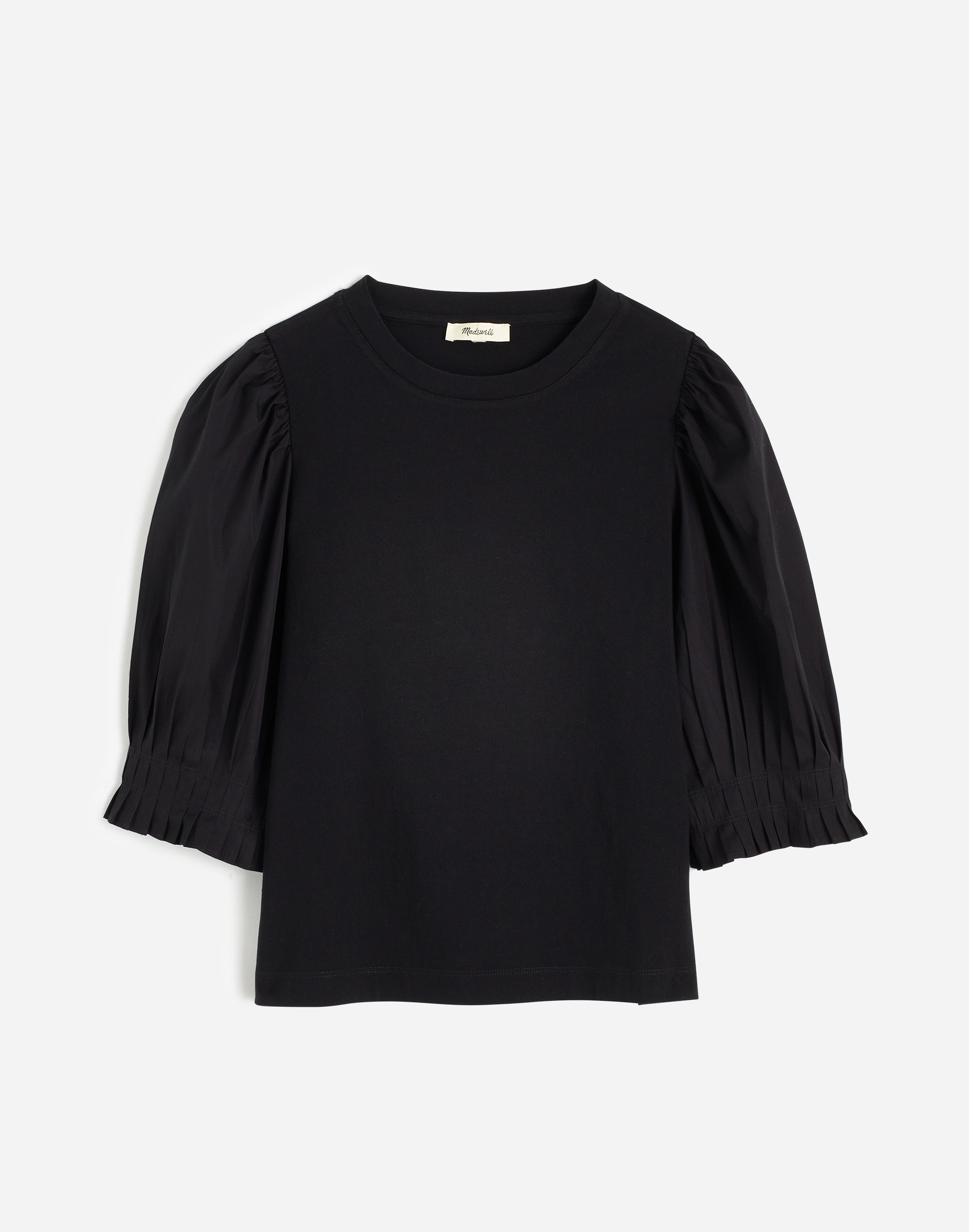 An elevated take on the classic tee, this versatile knit top features cotton poplin puff sleeves for a voluminous look. Finished with pleated details at the cuffs, it's an excellent addition to your work or everyday wardrobe.
