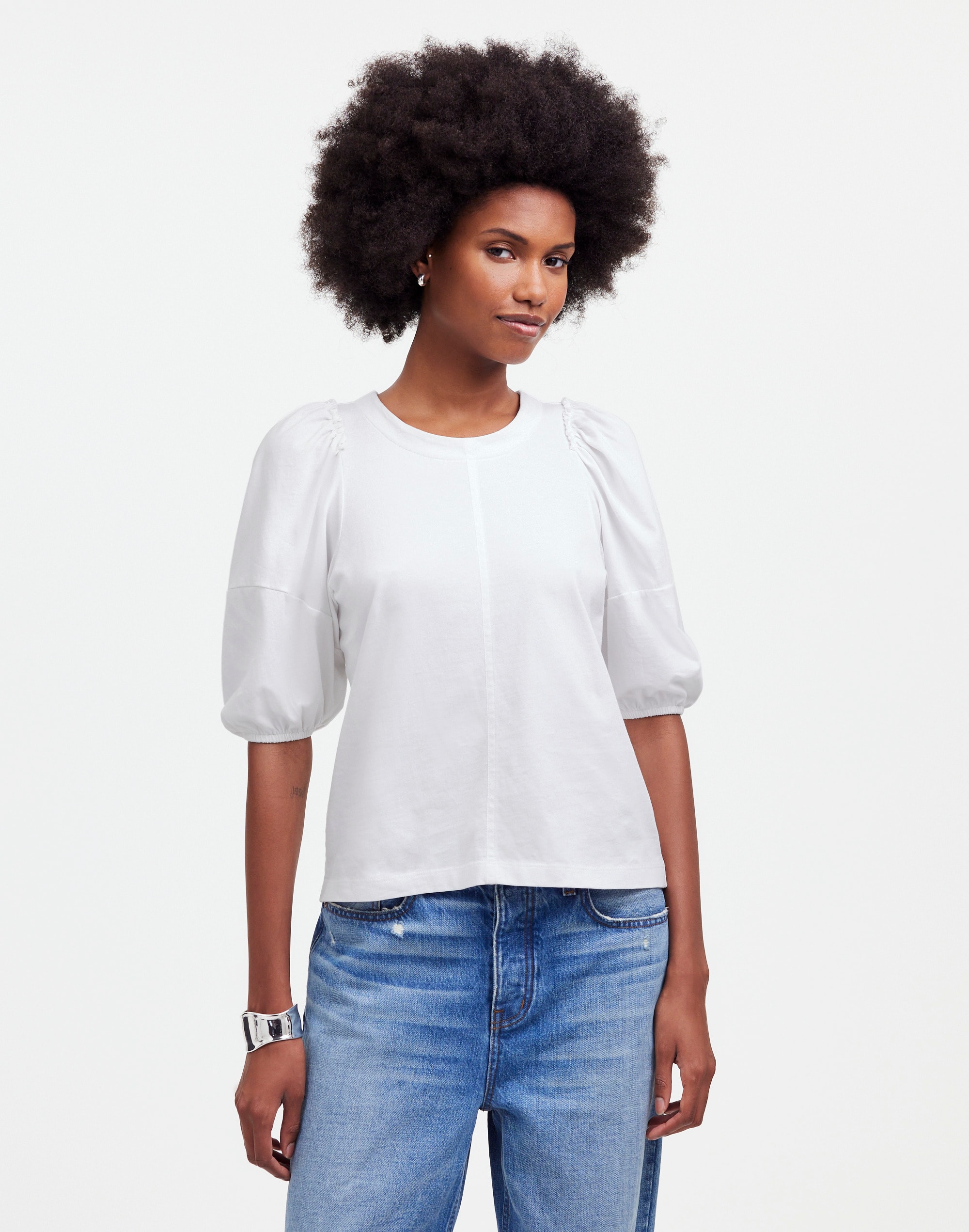 A definite favorite at Madewell HQ, this everyday tee is finished with special seaming details and raw-edge ruffle trim. Crafted of 100 percent cotton jersey, it has voluminous puff sleeves and a relaxed fit.
