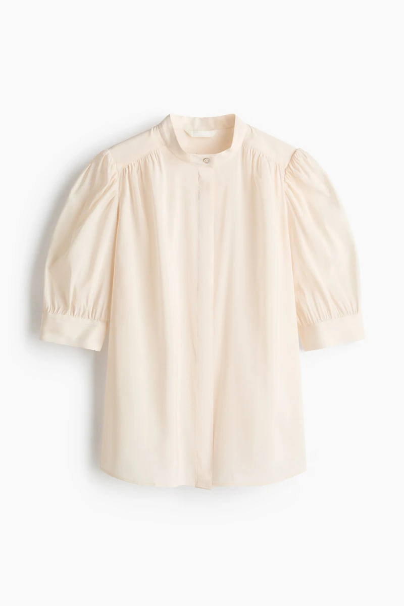 Blouse in woven fabric. Band collar, concealed buttons at front, and a double-layered yoke at front and back with gathers. Short puff sleeves with a slit and button at cuffs.