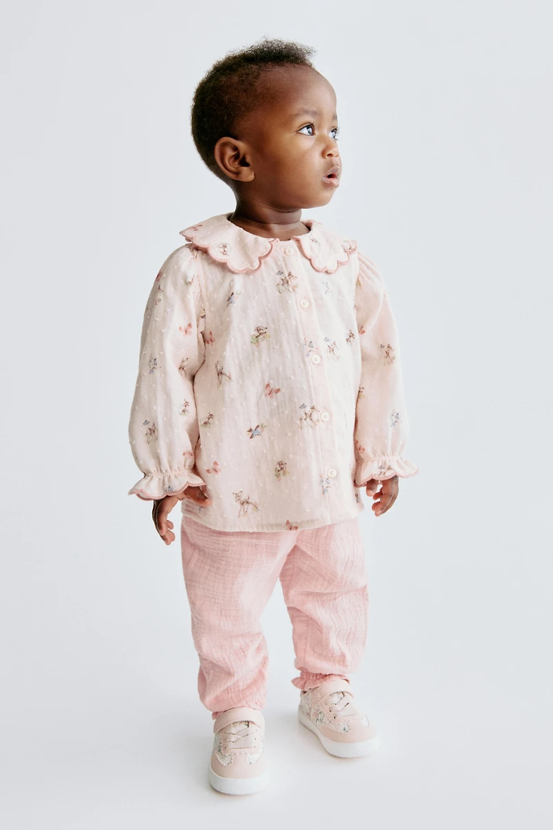 Pants in soft, woven cotton fabric. Decorative, faux wood buttons at waist and ruffle-trimmed, smocked elastic at waistband and hems.