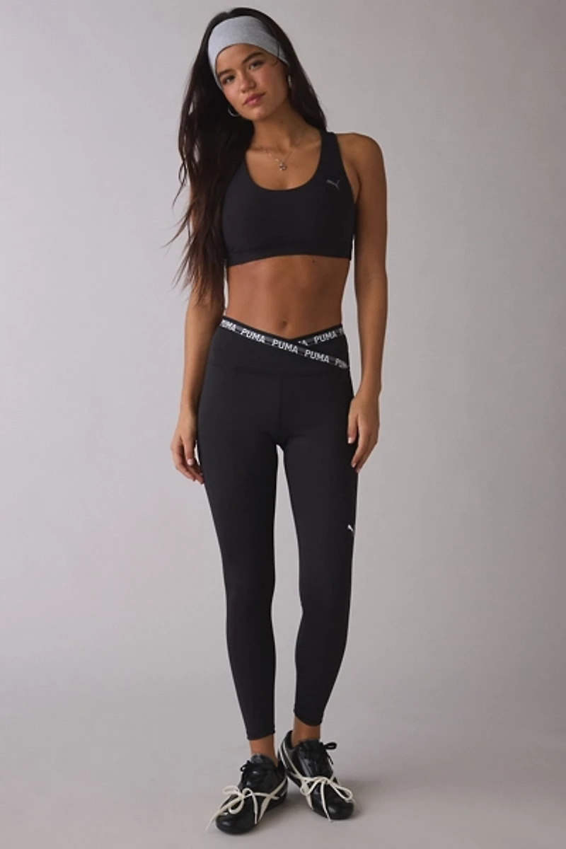Staple Puma training leggings elevated with a crisscross waistband with Puma Strong elastic for a secure fit for whatever the workout! Gym leggings in a a compressive, stretch fit featuring a high-rise, Puma logo detail at the thigh and cropped 7/8 length.