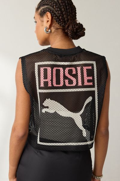 So sporty Puma jersey tee in collaboration with Rosé of BLANKPINK. Athletic mesh jersey designed in a relaxed, boxy fit featuring crew neckline, sleeveless design, Puma X Rosé graphics across the front & back and a cropped hem. Try it layered with a sports bra or cropped tank!