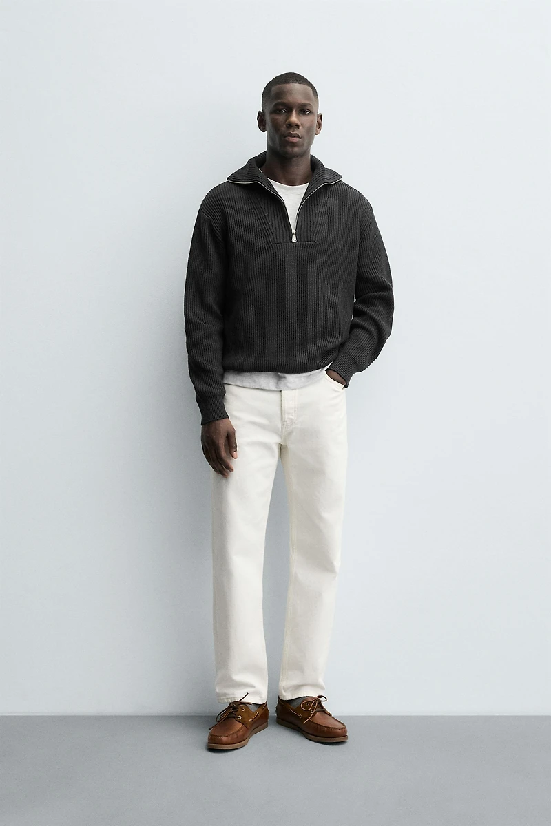 Relaxed fit sweater with a structured knit. Perkins collar with front zip fastening. Long sleeves. Ribbed trims.