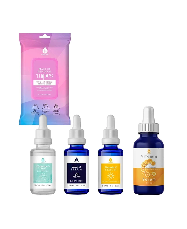 Pursonic Complete Skincare Essentials Bundle – Anti-Aging Serum Set, Vitamin C Serum, and Makeup Removal Wipes