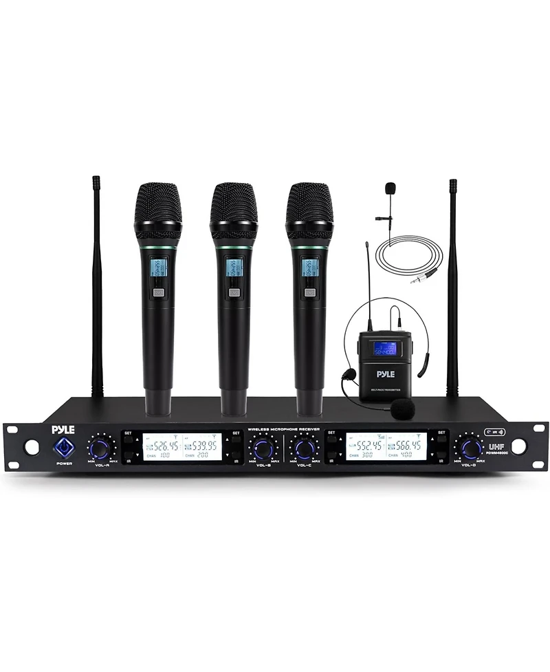 Pyle 4-Channel Wireless Microphone System with Handheld, Lavalier and Headset Mics PDWM4801