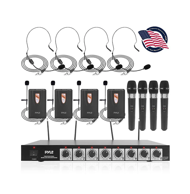 Pyle 8-Channel Wireless Microphone System with 4 Lavalier Mics, 4 Headsets, & 4 Handheld Mics