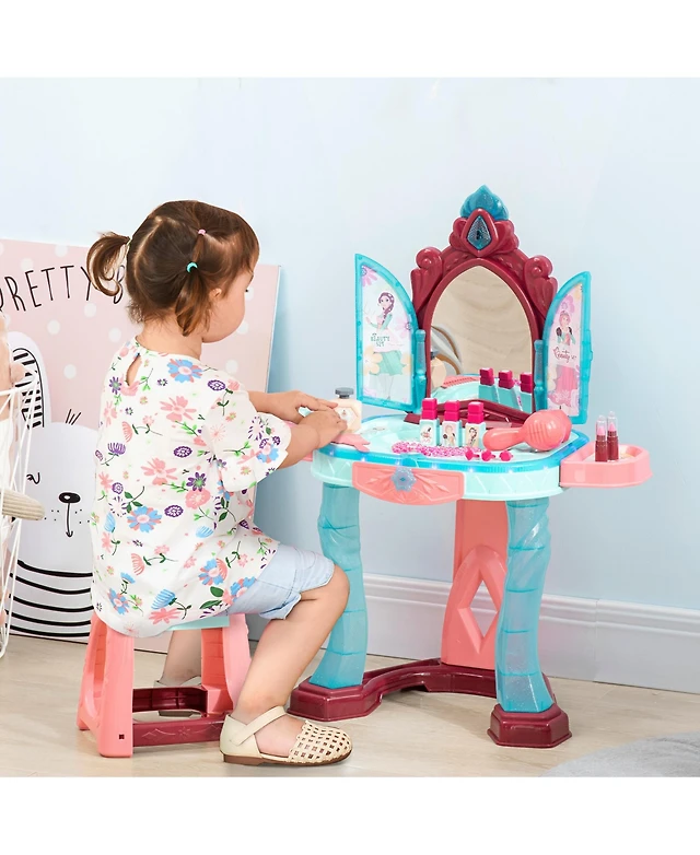 Qaba Kids Vanity Makeup Table Set with Chair and 31-Piece Collection, Mirror Princess Vanity Table with Self-Opening Magic Mirror, Music, Light, Imagi
