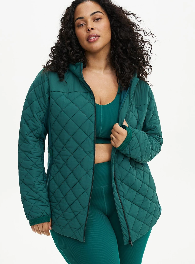 FIT Measures 32'' from shoulder (size 2). MATERIALS + CARE Active stretch nylon woven fabric. 88% nylon, 12% spandex. Machine wash cold, inside out. Tumble dry low. Imported. DETAILS Hooded neckline. Long sleeves. Zip front. Multiple functional pockets. Contrasting fabric at sleeves and sides.