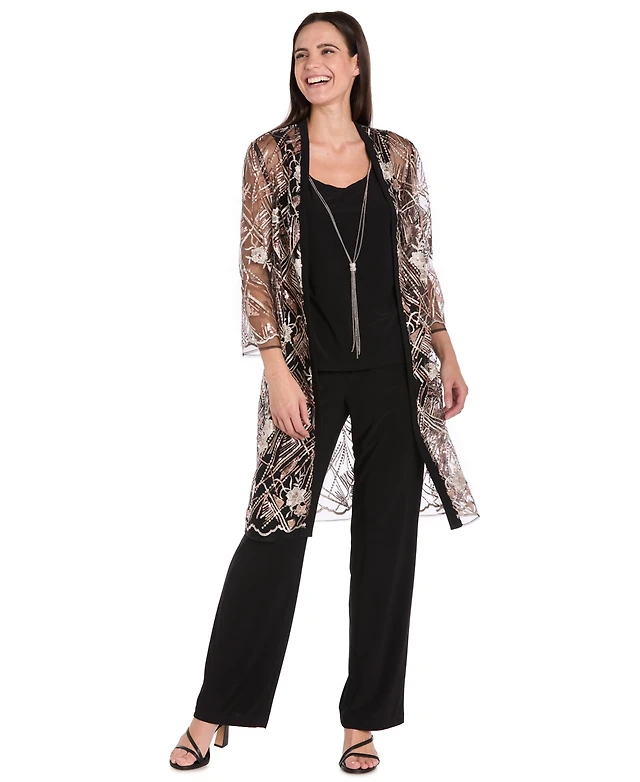 R & M Richards Women's Embellished Sheer Long Jacket, Sleeveless Top and Pants Set