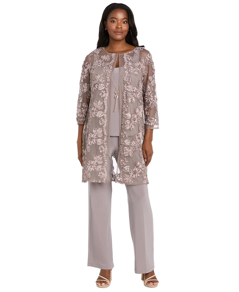 R & M Richards Women's Soutache Long Jacket, Necklace Top Pants Set