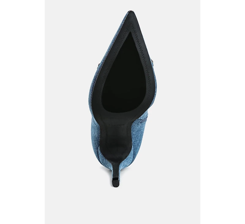 The stiletto boots are a statement piece with the chic denim upper and pointed heels. The little bow detail adds a touch of sophisticated allure, which is intriguing. The zipper fastening is convenient, while the comfortable cushion insoles cut strain.andnbsp. Type: Boots; Upper Material: Denim; Outer Sole: Tp Rubber; Closed Pointed Toe; Stiletto Heel; Bow Detail; Zipper Fastening; Comfortable Cushion Insole; Heel Height: 3.5 inches; RCSH5794.