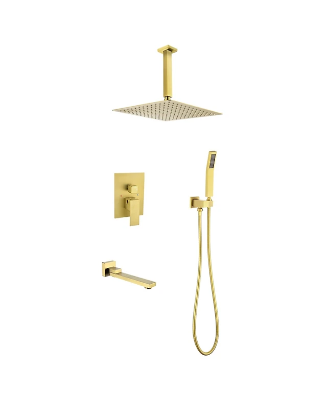 Rainsken Ceiling Mount Shower Faucet Set, Rain Mixer Shower Combo Set with Hand Shower, 16 inch Shower Head and Tub Spout, Brushed Gold