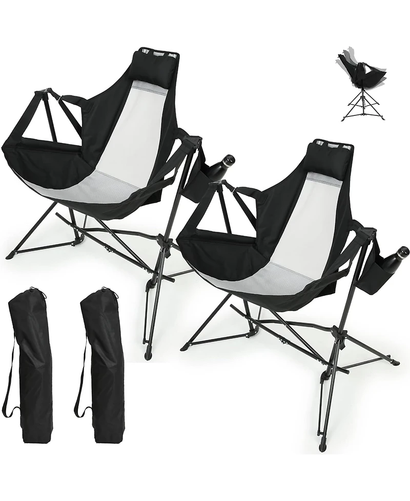 This set of 2 hammock camping chairs combines a unique hammock design with a sturdy folding structure for superior comfort outdoors. Featuring an oversized seat, adjustable backrest, and a portable carry bag, these rocking recliners are lightweight and easy to transport. Perfect for camping, travel, patio, lawn, and beach use, they deliver a relaxing experience for all your outdoor adventures.