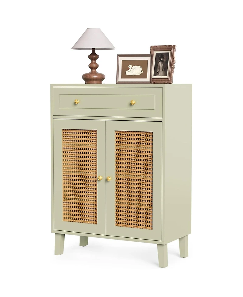Painted in a refreshing mint green, this wood cabinet delivers a modern and stylish appearance. The incorporation of rattan panels lends a rustic charm, making it the perfect blend of contemporary and vintage. Adapted to a variety of home decor styles, it can enhance the aesthetic atmosphere of the room with its unique design.