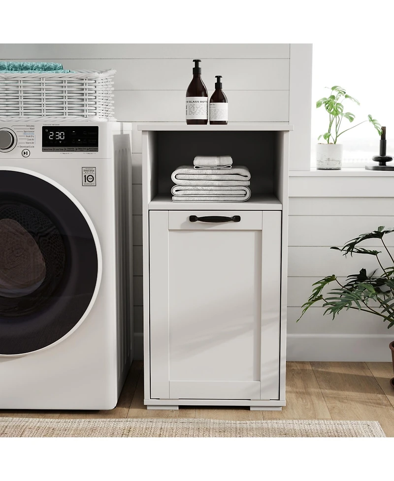 This Laundry Hamper Cabinet is a sleek, space-saving pull-out bathroom storage unit designed for small spaces, featuring a built-in removable liner bag that streamlines laundry sorting and storage for a clutter-free home.