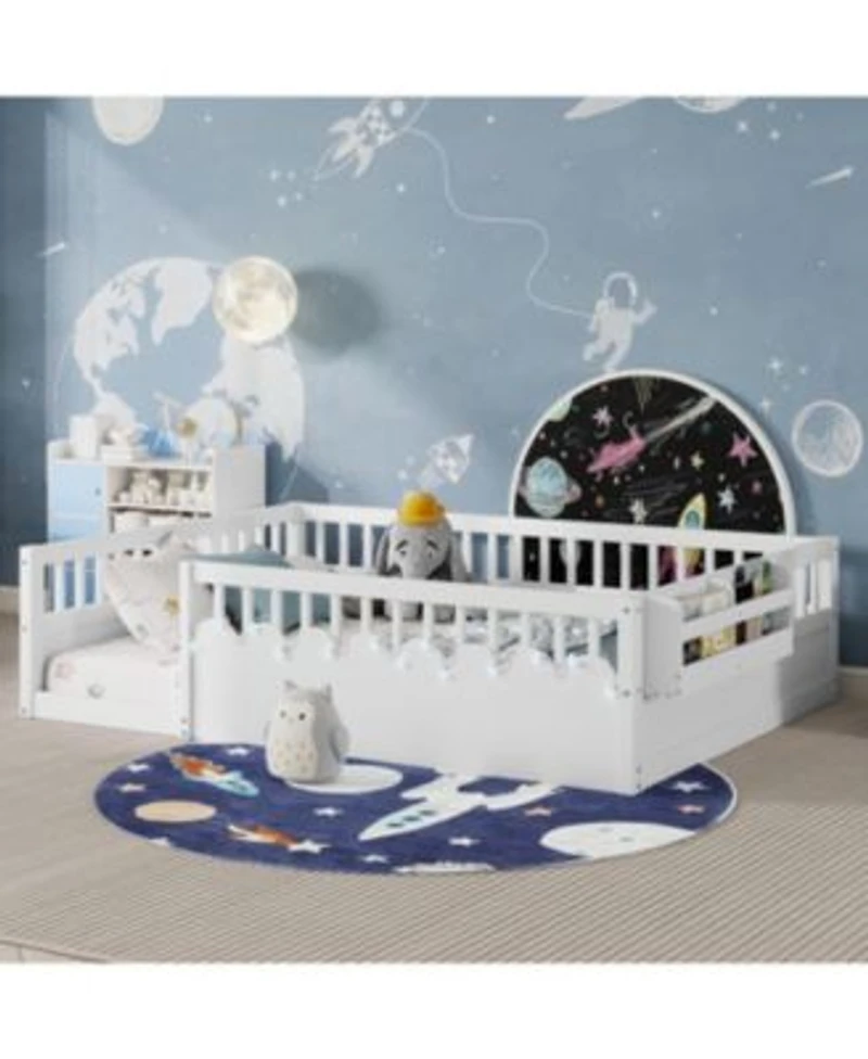 Montessori Floor Bed Frame with High Rails, Wood Kids Floor Beds with Light and Storage Shelf, This kids bed is a great helper for parents. The floor bed enables freedom of movement, independence, and mobility of the little one. The low bed profile allows your child to easily get in and out of bed, encouraging their sense of independence.