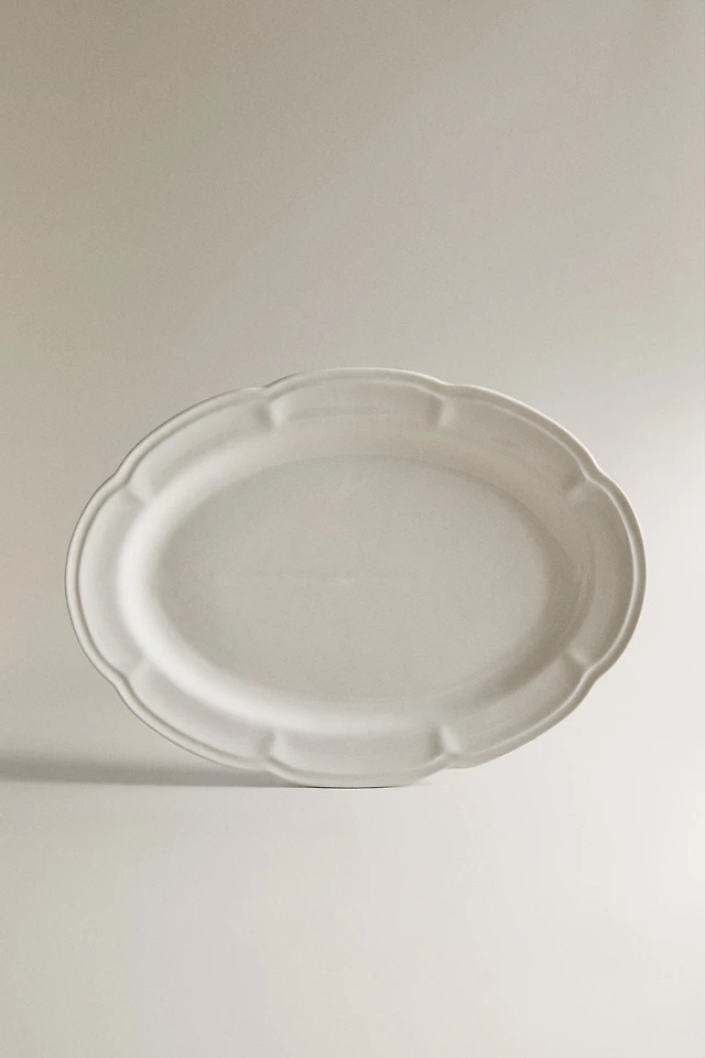 STONEWARE OVAL SERVING DISH WITH RAISED BORDER AND LINES