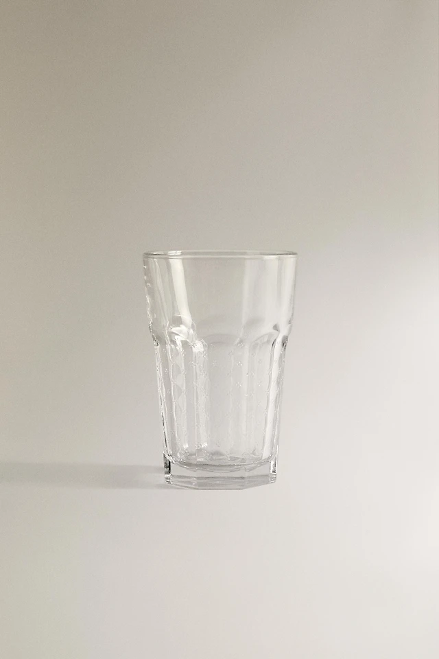 GLASS TUMBLER WITH RAISED GEOMETRIC DESIGN