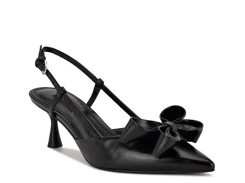 Fun, feminine, and oh so flirty, the Raska pumps from Nine West will become a formalwear staple! This slingback is designed with a modest kitten heel, a pointed toe, and a sweet bow accent.