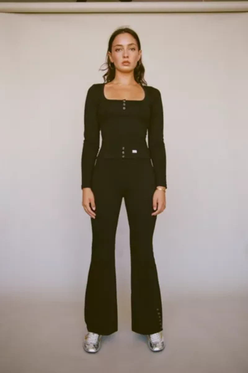 A fitted cotton-spandex pant with a soft, enzyme-washed hand. Designed with a contour seam at the back for a flattering fit and a bell-bottom leg finished with six functional snaps that can be worn open or closed. Sporty and easy to wear for lounging, errands, or light workouts. These pants pair nicely with our Butterfly Snap Top.