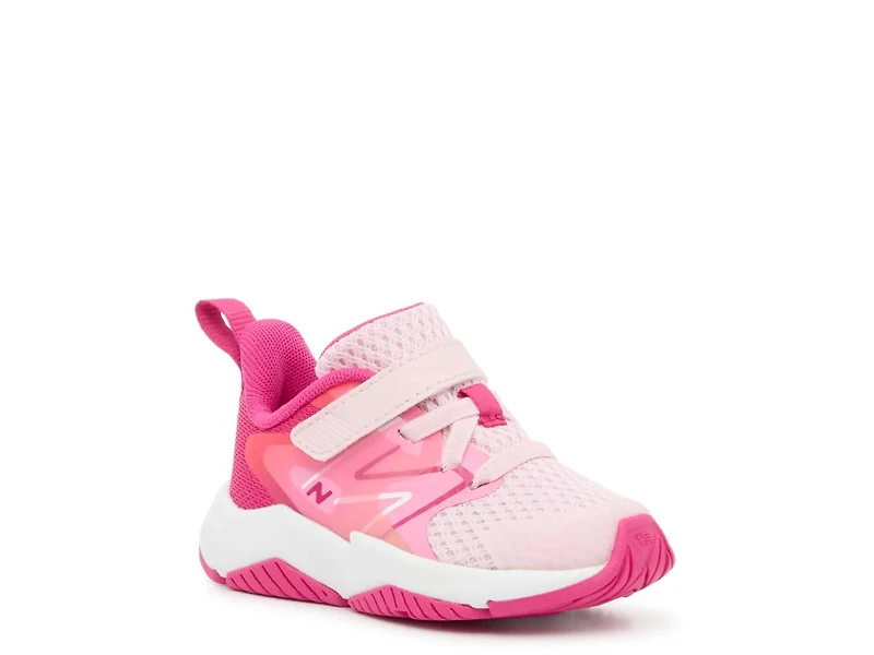 The New Balance Rave Run v2 sneaker for kids features a breathable mesh and synthetic upper, easy hook & loop strap with elastic laces, cushioned footbed, and durable rubber sole for comfort and support during active play. Perfect for toddlers on the move!