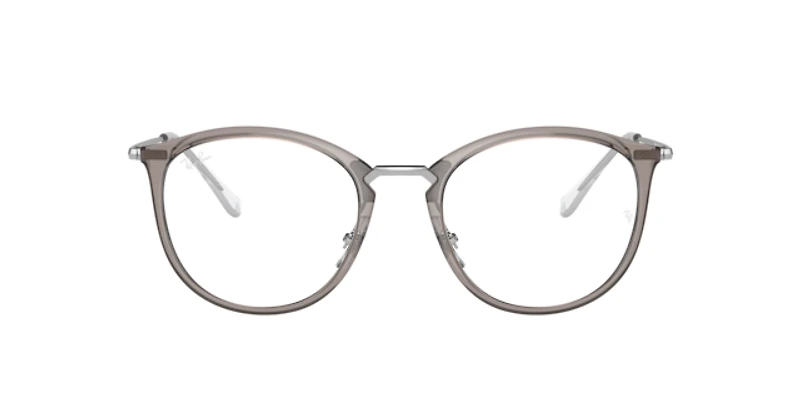 Ray-ban rb7140 optics exude a modern and sophisticated look, featuring a polished transparent grey frame in a unique phantos shape. The rimless design offers unobstructed vision, while the sleek black temples add a touch of elegance to these eyeglasses. These frames are not only stylish but also practical for everyday wear. Available with prescription lenses.
