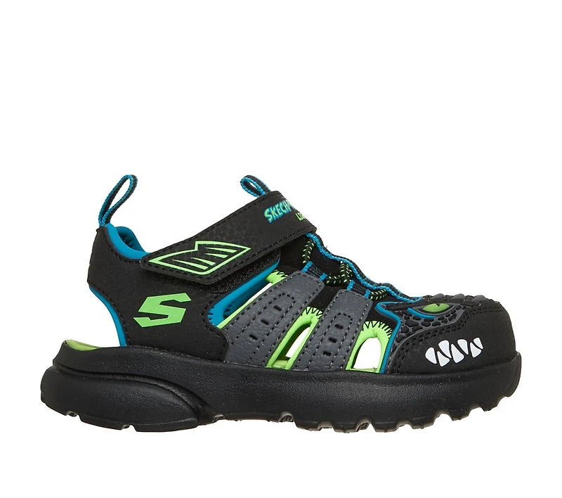 Stomp in roar-some fun and sunny-weather comfort with Skechers Razor Splash - Raptor Quest. This Skech-O-Sauras dinosaur themed fisherman sandal features a synthetic upper with light-up dino details, fixed stretch laces, and an adjustable instep strap, all on a cushioned comfort footbed.