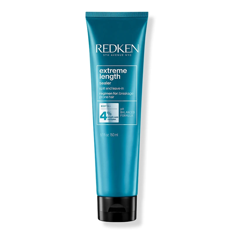 EXTR LEN SEAL 5.1FLOZ. Benefits: Strengthens damaged hair to grow longer and stronger. Helps prevent breakage so your hair can continue to grow longer. Reduces breakage. Visibly reduces the appearance of split ends. Strengthens weak, fragile hair. Adds manageability, smoothness and shine. Reduces breakage by 81%*. Visibly reduces the appearance of split ends by 78%*. *When using the full Extreme Length system (shampoo, conditioner & treatment). Key Ingredients: Redken's Length Care Complex featuring biotin and soy protein. :