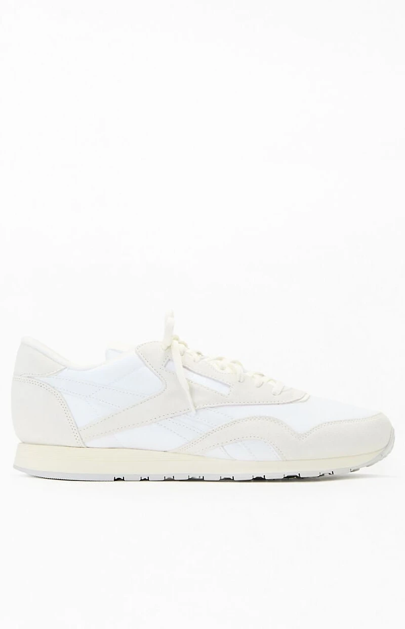 Step up your style with the Light Gray Classic Nylon Vintage Suede Shoes from Reebok. These everyday sneakers, true to their 1991 roots, feature a smooth nylon upper with buttery-soft suede overlays, offering a textured feel and a confident design that effortlessly pairs with any outfit. This product be returned to a Happy Returns bar location and can only be returned in-store or by mail. This supersedes all other Pacsun return policies.