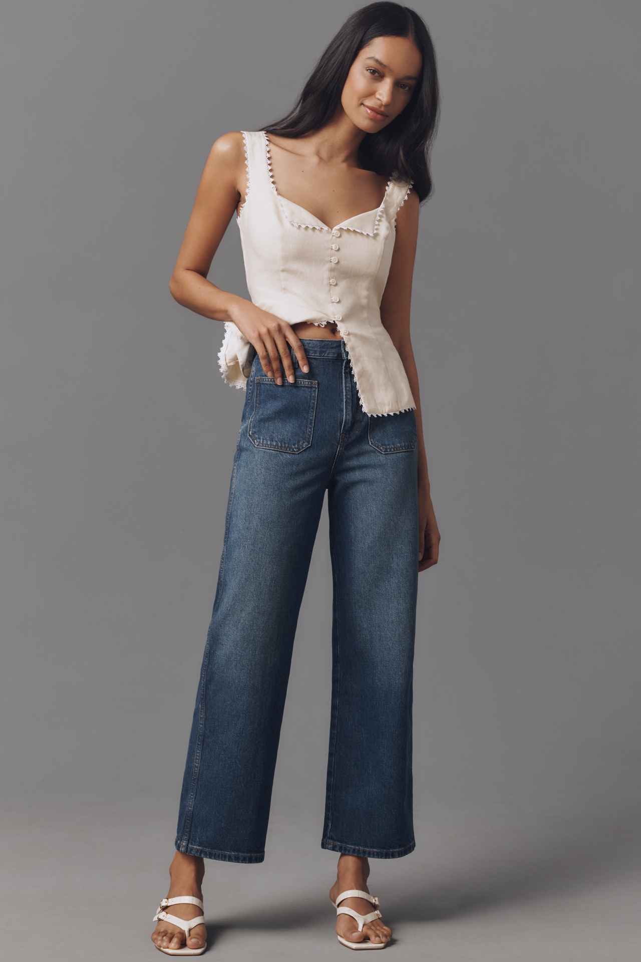 Crafted from denim with stretch, the Reformation Alyssa Jeans feature a high rise, wide leg, and front and back patch pockets.