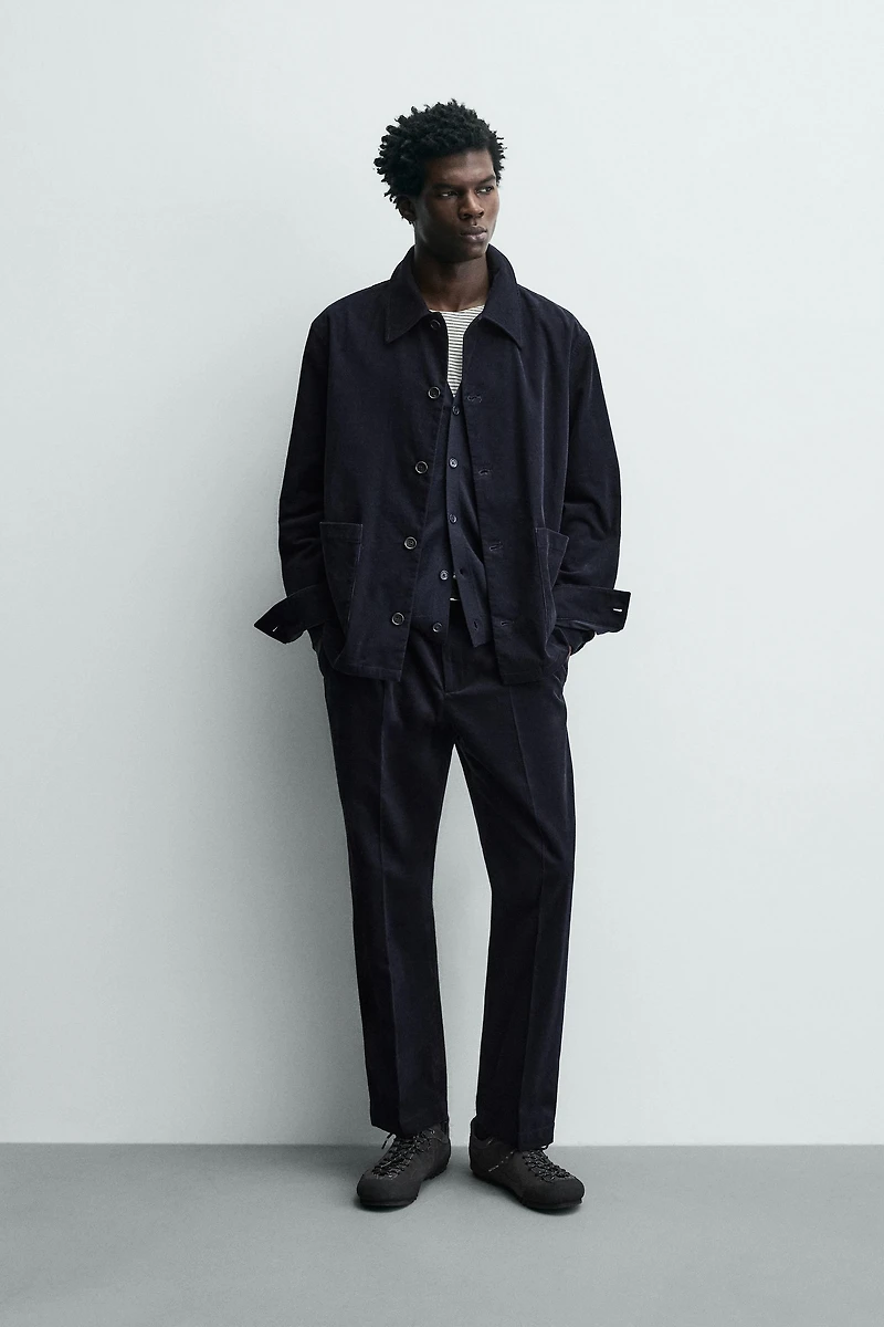 Regular fit pants made of lightweight cotton corduroy. Adjustable waist with inner drawstring. Front pockets and back welt pockets with button. Front zip and button closure.