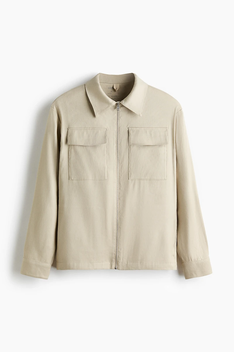 Overshirt in a stretchy, moisture-wicking woven linen blend. Easy-care, simple to wash and requires minimal ironing. Turn-down collar, zipper at front, and a yoke at back. Patch chest pockets with flap, discreet side pockets with zipper, and long sleeves with button at cuffs. Straight-cut hem. Functional Essentials is a curated selection of casual wear with a focus on comfort and performance.