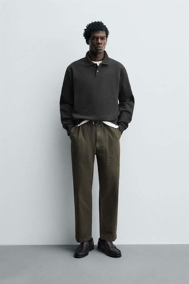 Regular fit polo shirt made of cotton fabric with a plush interior. Lapel collar with front button closure. Long sleeves. Ribbed trim.