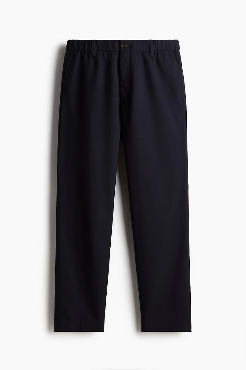 Regular-fit pants in twill with a comfortable, classic silhouette. Covered elastic at waistband and zip fly with button. Diagonal side pockets, back pockets with flap and a button, and straight legs.