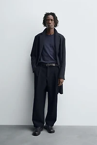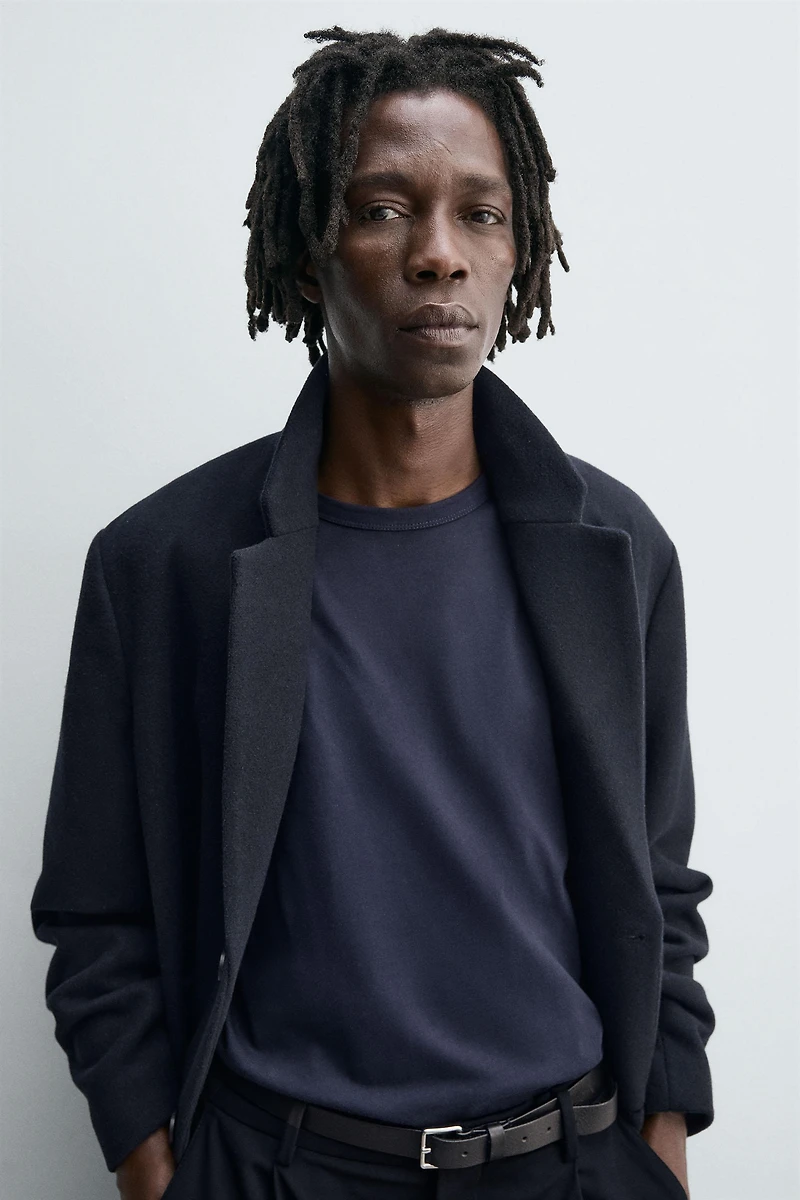 Regular fit coat made of compact wool-blend fabric. Notched lapel collar and long sleeves. No inner lining. Welt pockets at the hip. Hem with vent at center back. Front button closure.