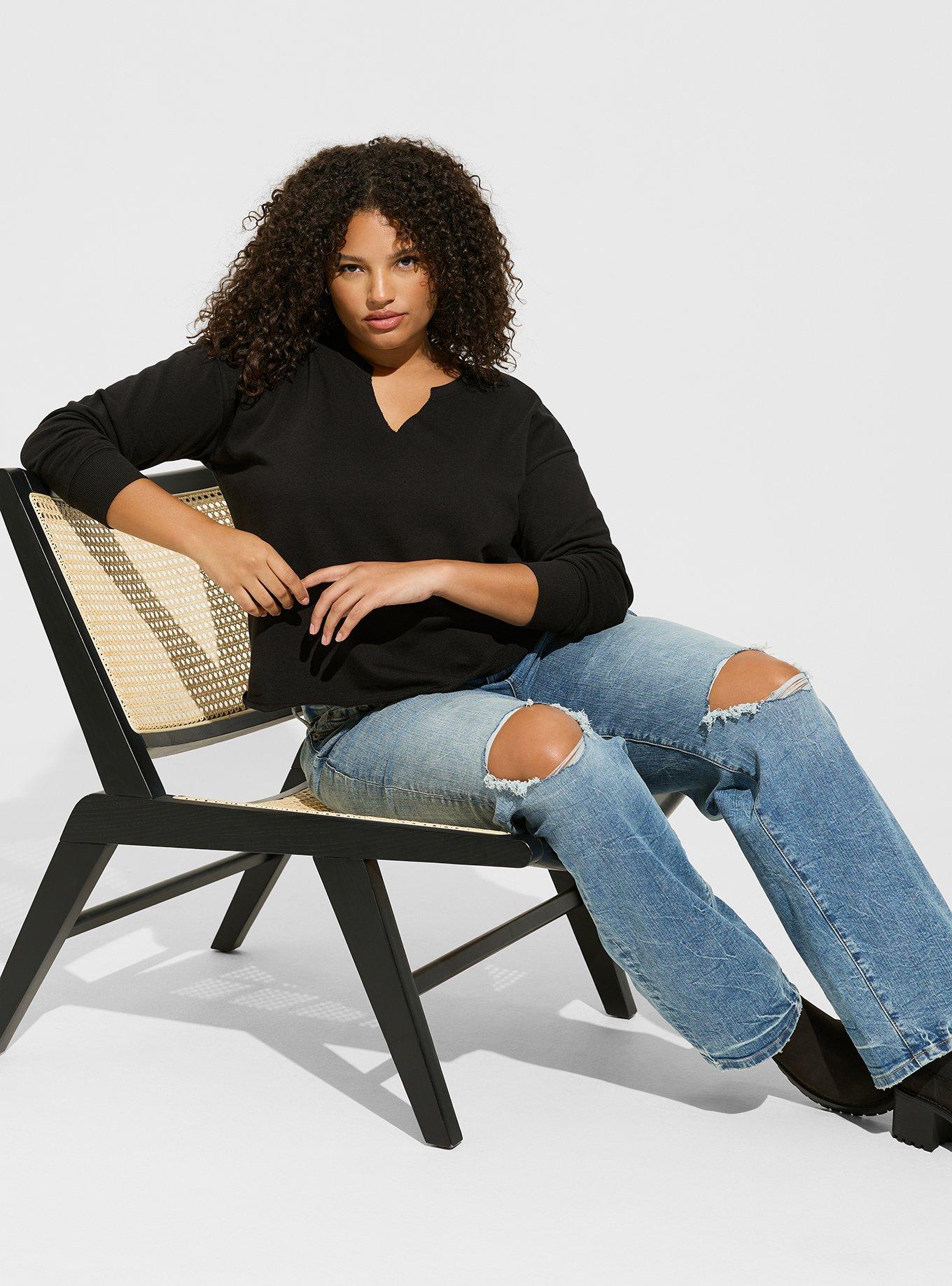 Relaxed Fit Cozy Fleece Notch Neck Drop Shoulder Crop Sweatshirt