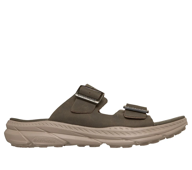 Welcome warm-weather days in quality comfort with Skechers Relaxed Fit®: Delano Sandal - Portman. This dual-buckle strap slide features a genuine leather upper and a contoured Luxe Foam® cushioned footbed.