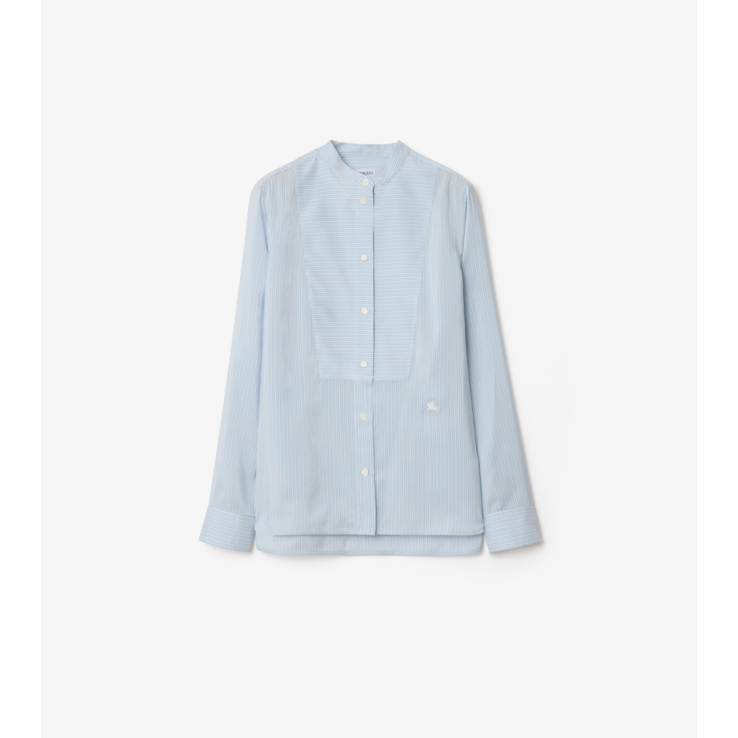 A long-sleeved shirt made from silk poplin woven with vertical and horizontal stripes. Tailored to a relaxed fit, the grandad collar style features a bib front and is detailed with an embroidered Equestrian Knight Design. Button closure Grandad collar Single-button cuffs Curved, stepped hem Embroidered Equestrian Knight Design at front