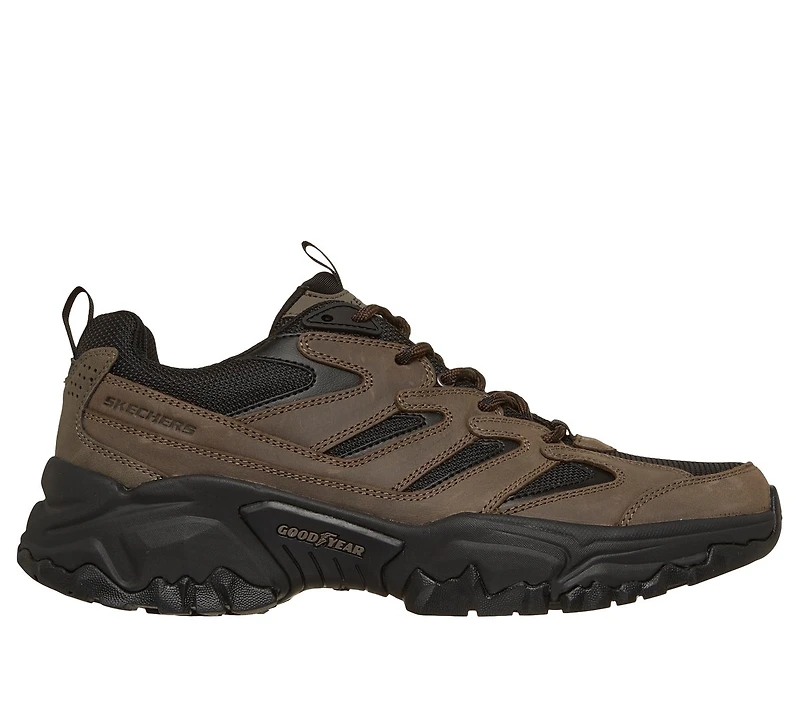 Embark on a new adventure in rugged comfort with Skechers Relaxed Fit®: Terraform - Ward. This roomy hiking style features a lace-up leather and woven underlay upper, a charcoal-infused Skechers Air-Cooled Memory® insole, and a high-traction Goodyear® Rubber outsole.