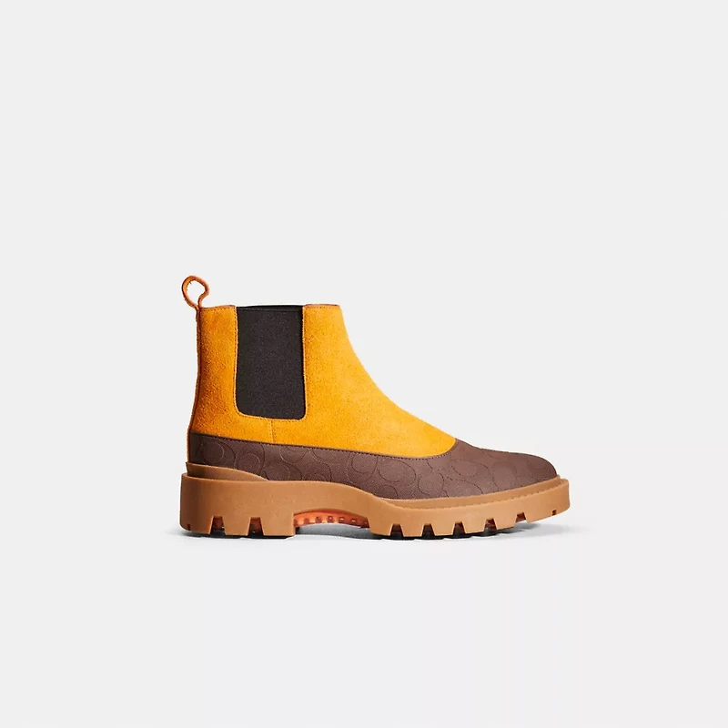 A little (re)love goes a long way. Sourced from the shelves of our Coach Repair Workshop, this pair of boots was lovingly restored to its original condition by our talented craftspeople. Keeping waste out of landfills and reducing our impact on the environment is all part of our commitment to doing better for the planet (and all of us). A feel-good find, it’s your chance to get one of our most-loved styles if you missed out the first time.Stand up to rainy days and changeable weather with our protective rubber-base Chelsea boot made with proprietary Coach CitySole technology for maximum comfort and flexibility. An updated take on a classic style, it sits at the intersection of fashion and function. Crafted of easy-to-clean rubber and buffed suede, it features a pull tab for an easy slip-on fit and a layer of shock-absorbing cushioned pods that provide all-day support. It’s finished with a lug sole for superior movement and traction.
