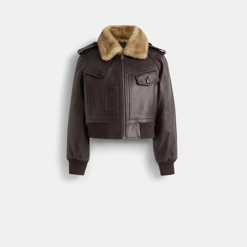 A little (re)love goes a long way. Sourced from the shelves of our Coach Repair Workshop, this jacket was lovingly restored to its original condition by our talented craftspeople. Keeping waste out of landfills and reducing our impact on the environment is all part of our commitment to doing better for the planet (and all of us). A feel-good find, it’s your chance to get one of our most-loved styles if you missed out the first time. Wear it, love it, pass it on.A luxe take on a vintage military-inspired flight jacket, this leather aviator style features a supersoft plush shearling collar for added warmth when temperatures drop. The Signature-lined cropped silhouette is finished with slip pockets, a front flap pocket and ribbed trim.
