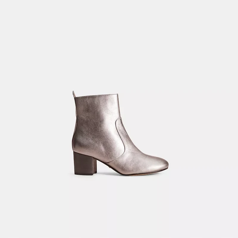 A little (re)love goes a long way. Sourced from the shelves of our Coach Repair Workshop, this pair of booties was lovingly restored to its original condition by our talented craftspeople. Keeping waste out of landfills and reducing our impact on the environment is all part of our commitment to doing better for the planet (and all of us). A feel-good find, it’s your chance to get one of our most-loved styles if you missed out the first time.Crafted of metallic leather, the Juliet ankle boot is a minimalist, wear-with-everything design. The low, chunky heel makes it comfortable for everyday wear or late-night dancing.