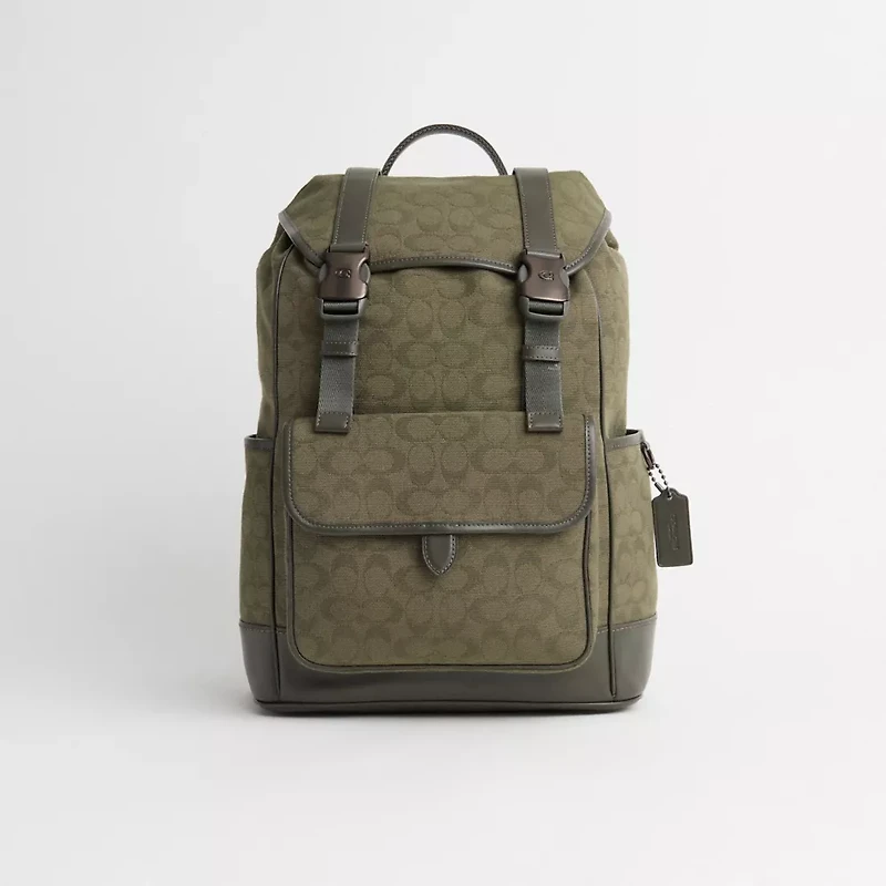 A little (re)love goes a long way. This League Flap Backpack is a gently worn design restored to its original condition by the talented craftspeople at our Coach Repair Workshop. Passed along from members of the Coach community like you, it helps to keep bags out of landfills and reduces our impact on the environment—part of our commitment to doing better for the planet (and all of us). A feel-good find, it’s your chance to get one of our most-loved styles if you missed out the first time. Wear it, love it, pass it on.Made for a life in constant motion, the League keeps your game plan on track. Crafted of refined leather and our durable Signature canvas jacquard, this roomy backpack is a comfortable choice for every day with its padded back and straps. Organized with multiple pockets inside and out, the sporty style has a dedicated laptop sleeve and plenty of space for notebooks, water bottles and other essentials. An exterior zipper gives easy access to the main compartment.