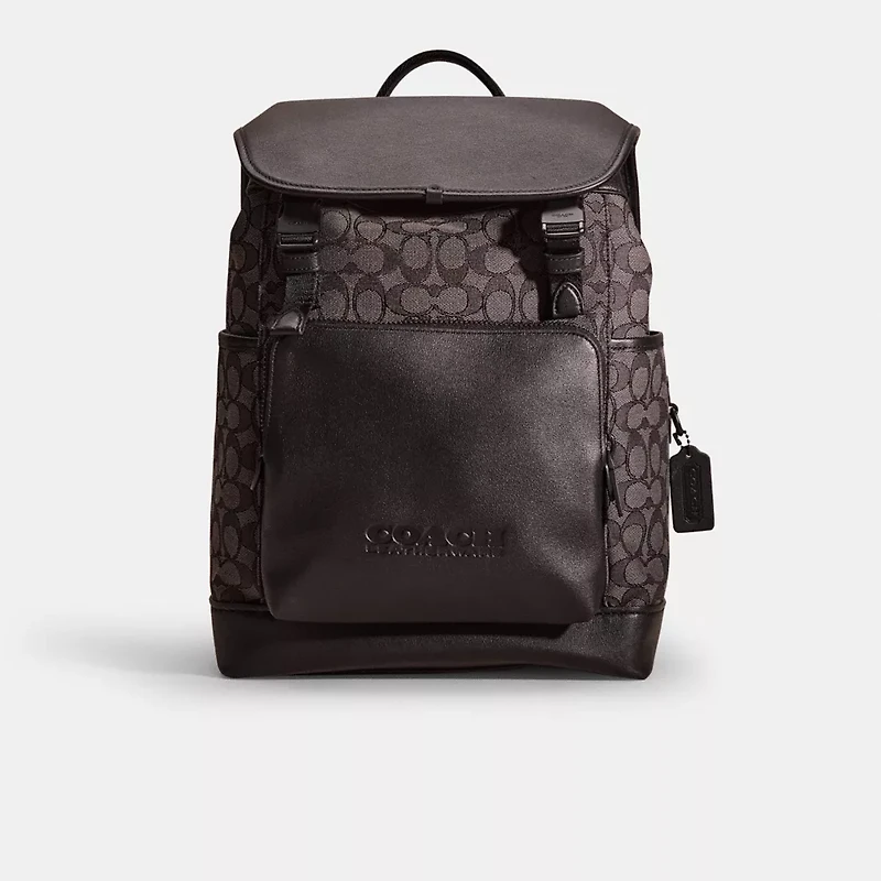 A little (re)love goes a long way. This League Flap Backpack is a gently worn design restored to its original condition by the talented craftspeople at our Coach Repair Workshop. Passed along from members of the Coach community like you, it helps to keep bags out of landfills and reduces our impact on the environment—part of our commitment to doing better for the planet (and all of us). A feel-good find, it’s your chance to get one of our most-loved styles if you missed out the first time. Wear it, love it, pass it on.Crafted of lightweight Signature jacquard with refined leather, this roomy League backpack has multiple pockets inside and out, a dedicated laptop sleeve and plenty of space for notebooks, water bottles and more.