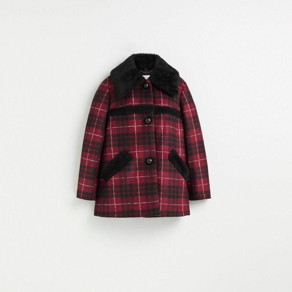 A little (re)love goes a long way. Sourced from the shelves of our Coach Repair Workshop, this coat was lovingly restored to its original condition by our talented craftspeople. Keeping waste out of landfills and reducing our impact on the environment is all part of our commitment to doing better for the planet (and all of us). A feel-good find, it’s your chance to get one of our most-loved styles if you missed out the first time. Wear it, love it, pass it on.This bright tartan plaid coat is a perfect option for every day. It's finished with shearling trim and a plush shearling collar to keep out the chill.