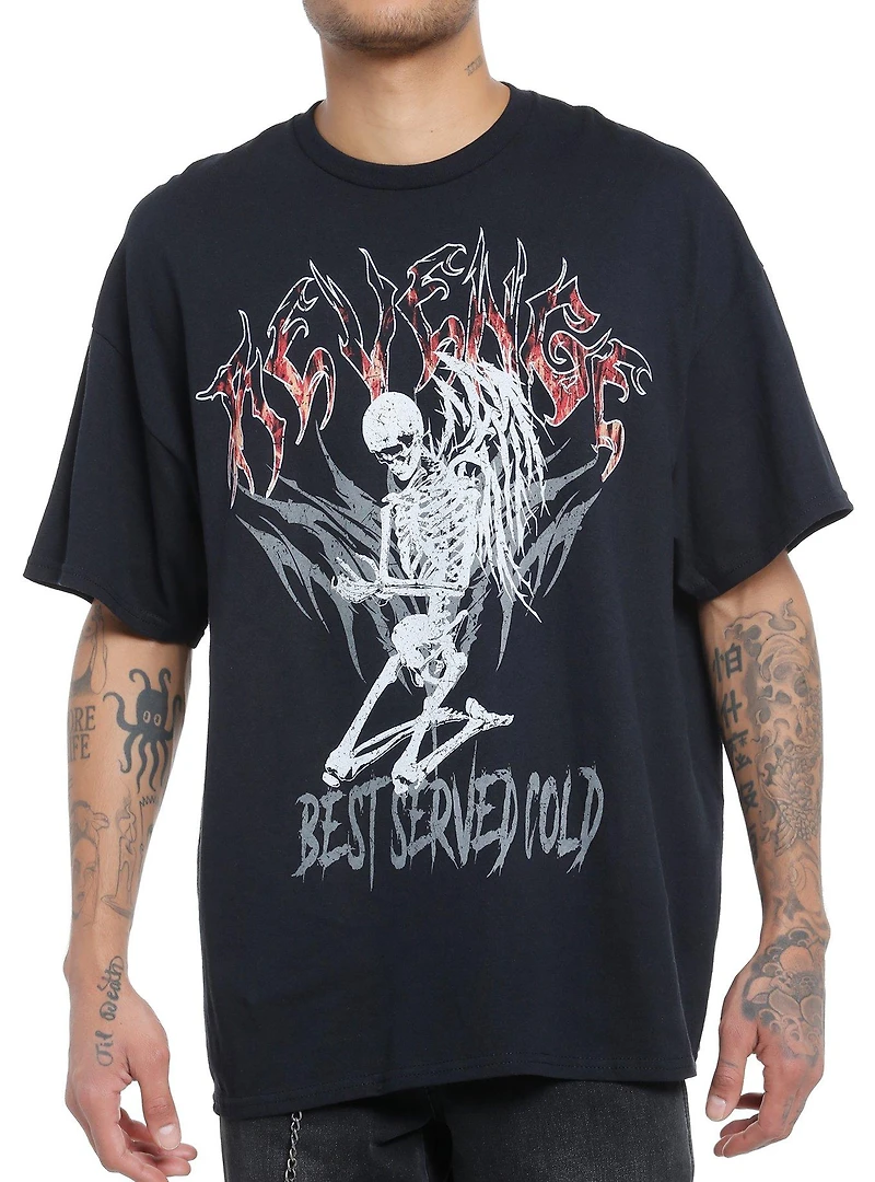Serve looks (and revenge) in this tee! It has an oversized fit and features a winged skeleton staring down at its hands, framed by "Revenge best served cold."